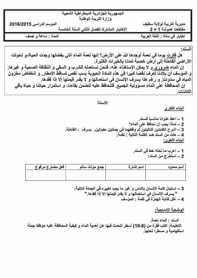 اختبارات السنة الخامسة ابتدائي في مادة اللغة العربية الفصل الثاني