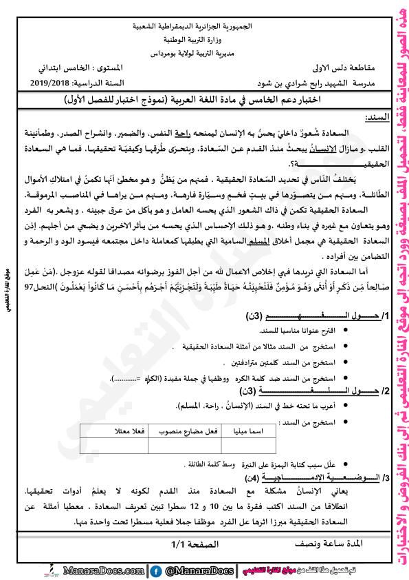 نموذج رقم 01 لاختبارات اللغة العربية للفصل الاول السنة الخامسة 5