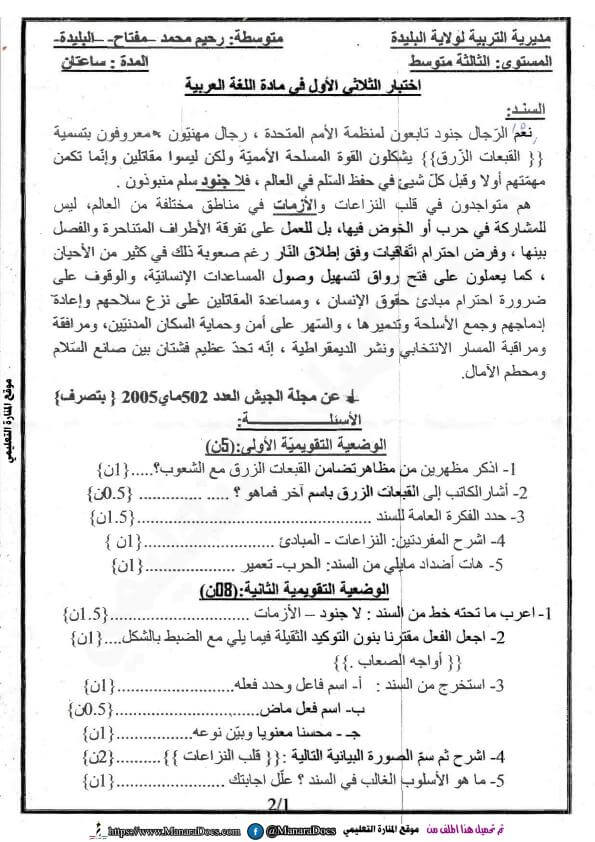 اختبارات السنة الثالثة متوسط الجيل الثاني الفصل الاول في اللغة العربية