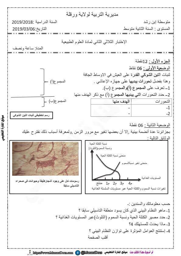 اختبارات السنة الثانية متوسط في العلوم الطبيعية الفصل الثاني