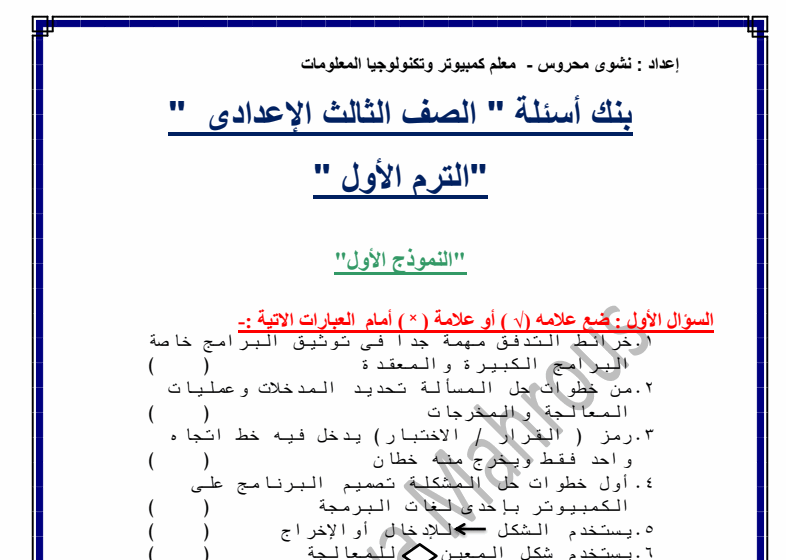 بنك اسئلة ونماذج امتحانات الكمبيوتر بالاجابات للصف الثالث الاعدادى
