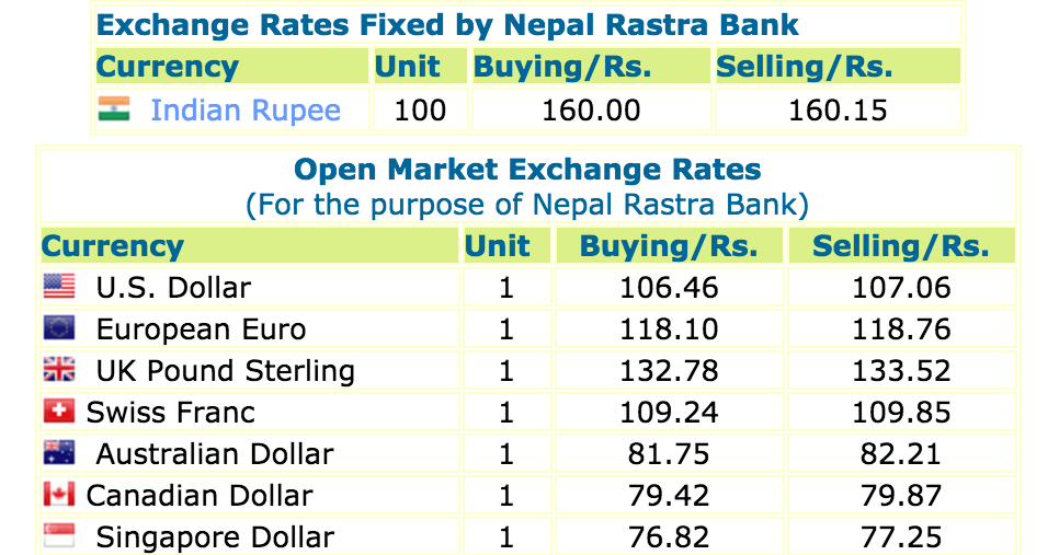 Central bank is the policy maker bank related to foreign exchange. Due to the agreement the exchange rate of nepali currency with indian rupee is always fixed at 16 npr per 1 inr. Foreign exchange rates fixed by nepal rastra bank. Check out todays foreign exchange rate in nepal rastra bank nepal rastra bank exchange rate today.
