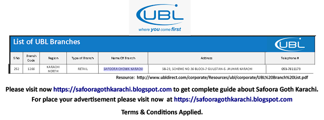 United Bank Limited Ubl Safoora Goth And Chowk Karachi Branch